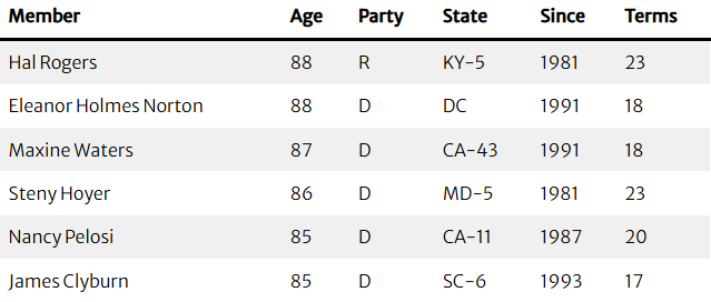 And they are not alone. Across the full House, members aged 70-79 now constitute 16.9% of the body. Members 80 and up represent 6.5% of House Democrats and 4.1% of House Republicans. This is not a functioning legislature. This is a gerontocracy.