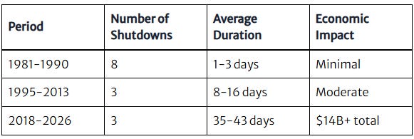 Look at the pattern: shutdowns used to be measured in hours or days. Now they’re measured in weeks. What was once a rare procedural accident has become a recurring weapon in partisan warfare.