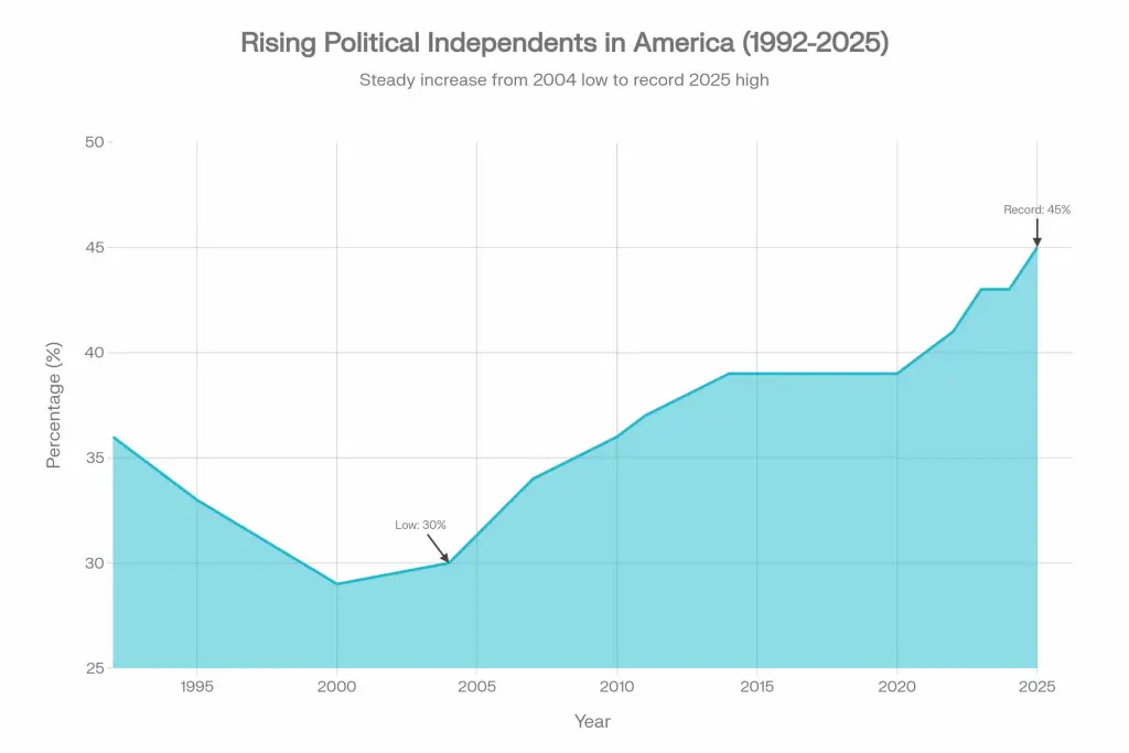Americans have responded by abandoning party labels entirely. The share of independent voters has risen from roughly one-third in the early 2000s to 45 percent today. Among voters under 30, over half now identify as independents, suggesting this trend will only accelerate.