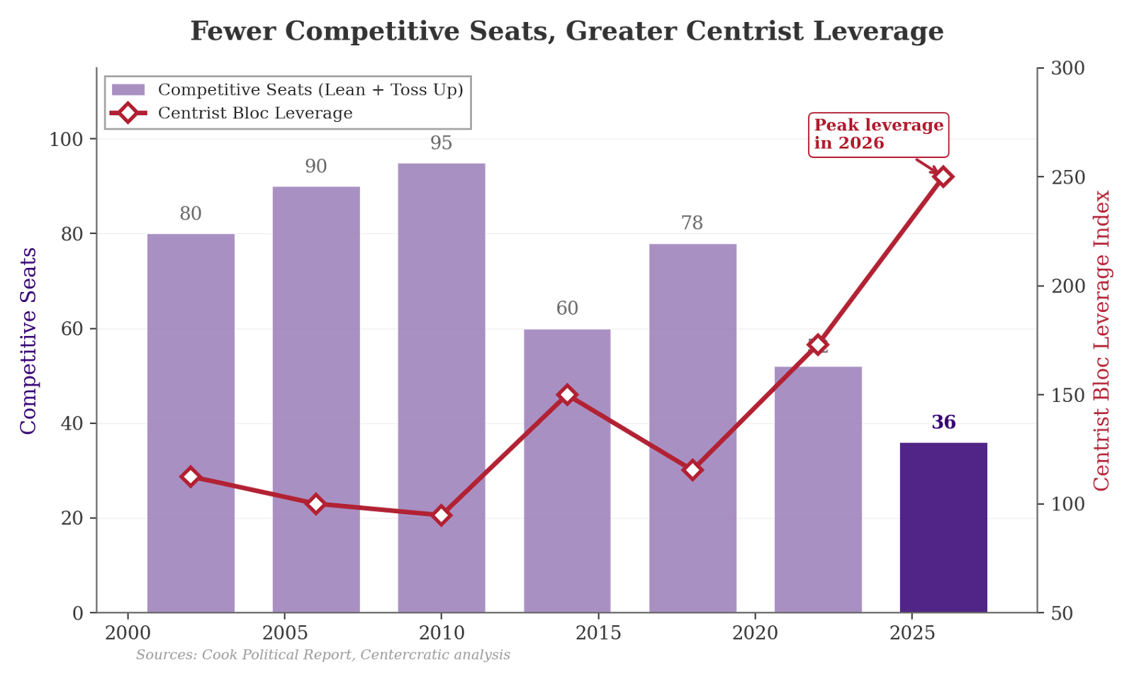 There is a structural consequence of the narrowing battlefield that almost no one in Washington is talking about, and it is the most important finding in this analysis. As the number of competitive seats shrinks, the leverage of a small centrist bloc grows in direct proportion.