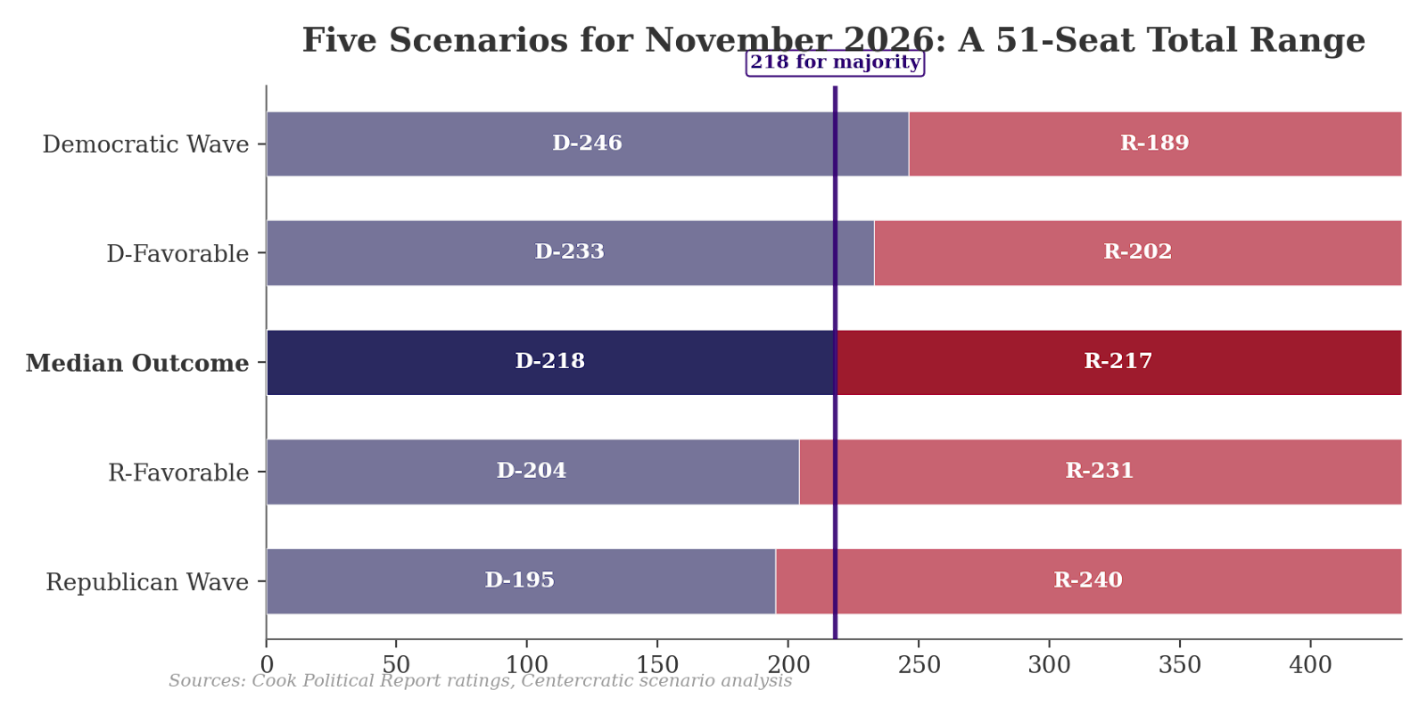 To understand what that means in practice, consider five scenarios for November, ranging from a Republican wave to a Democratic wave. Across all five, the total range of outcomes is just 51 seats. Democrats could win as few as 195 seats in a Republican landslide or as many as 246 in a Democratic surge. The median outcome, based on current forecasting consensus, points to approximately 218 Democratic seats, the barest possible majority.10