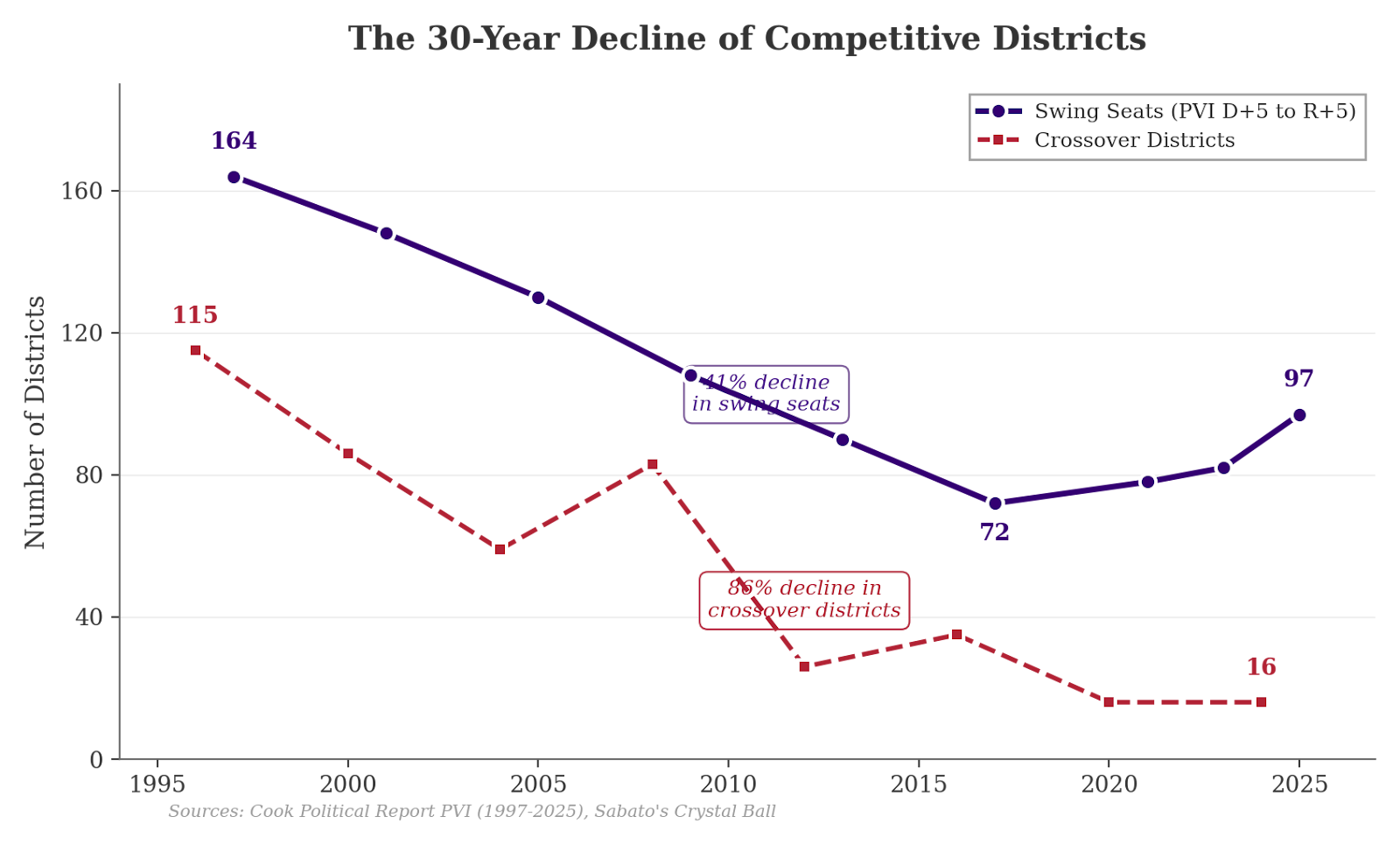 That center has been collapsing ever since. By 2017, the number of swing districts had fallen to just 72, a 56 percent decline in two decades. A modest recovery brought the count back to 97 by 2025, driven partly by redistricting reform in states like California, Michigan, and Colorado. But even at 97, the swing seat count sits 41 percent below where it started.2