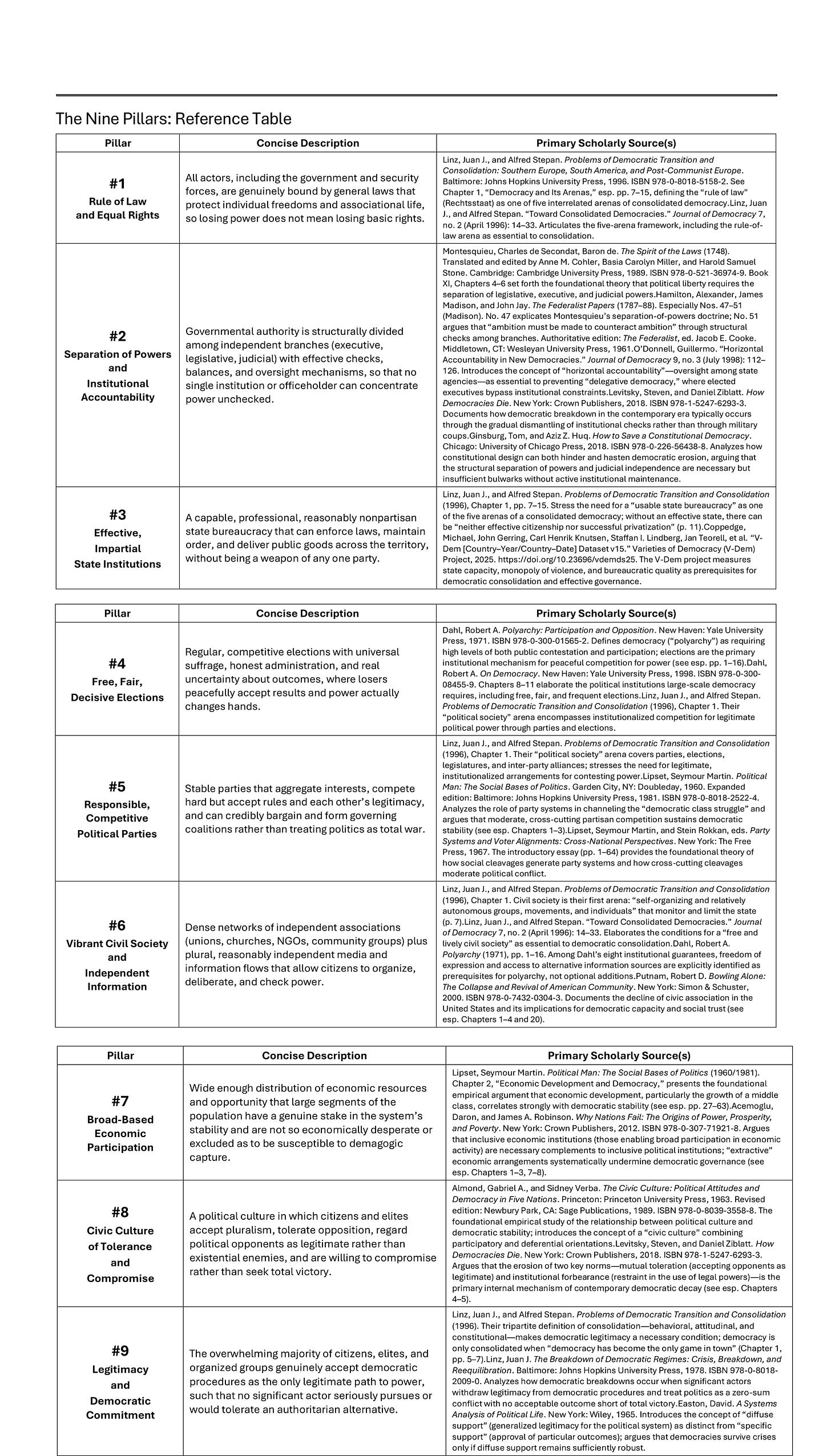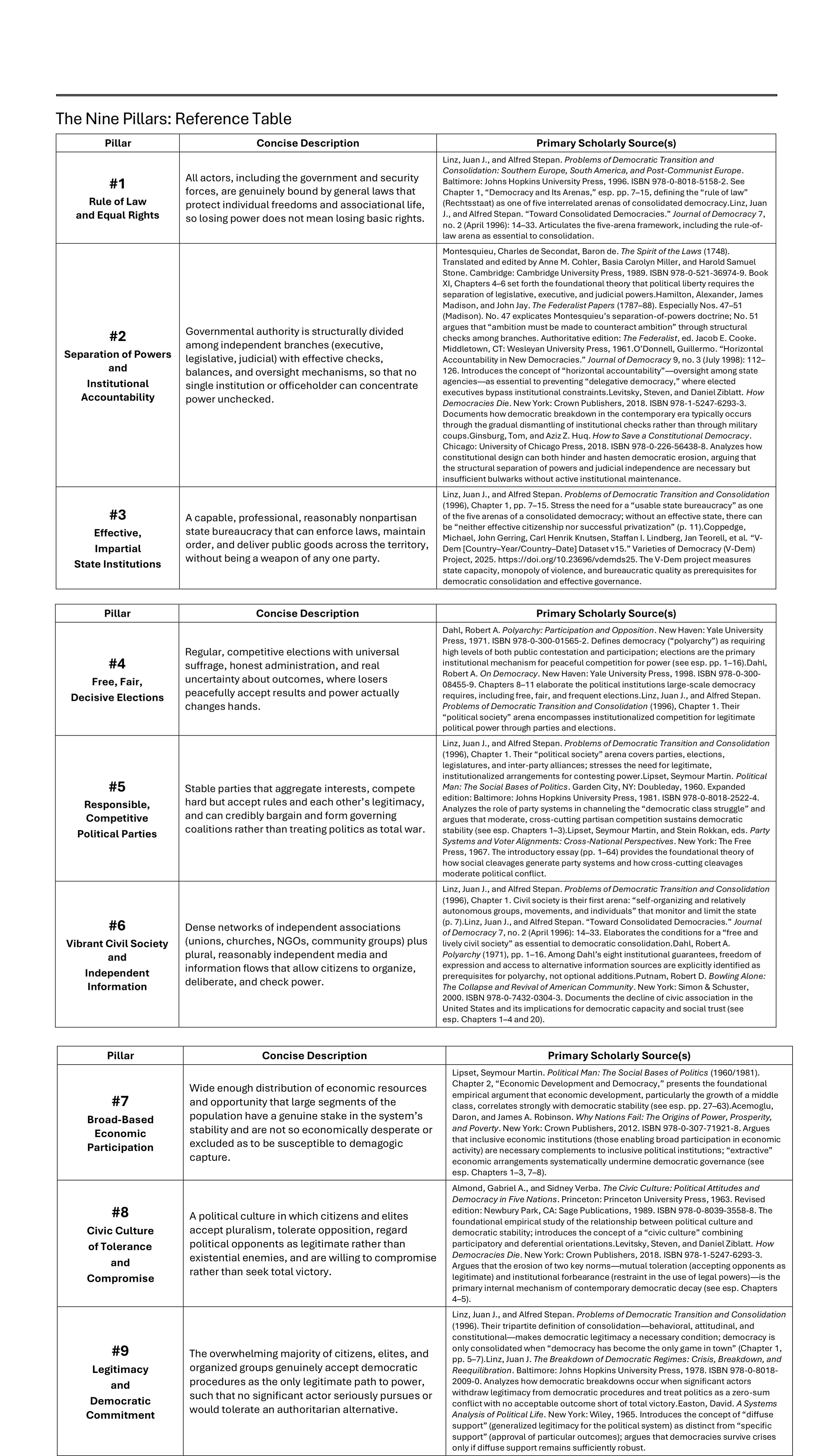 The nine pillars presented in the table that follows represent an original synthesis that integrates these distinct but convergent scholarly traditions into a single accessible architecture. They draw upon Linz and Stepan’s arenas of consolidation, Dahl’s institutional guarantees for polyarchy, Lipset’s socioeconomic correlates of democratic stability, and the separation-of-powers tradition running from Montesquieu through the American Founders to O’Donnell’s concept of horizontal accountability and the contemporary literature on democratic backsliding.26